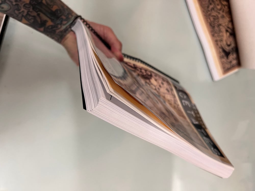 174 pages! Color copies of flash and photos to start it off and then 164 pages of the acetates that were at Bert Grimm’s seaside tattoo shop, which was Bert’s last place of tattooing.